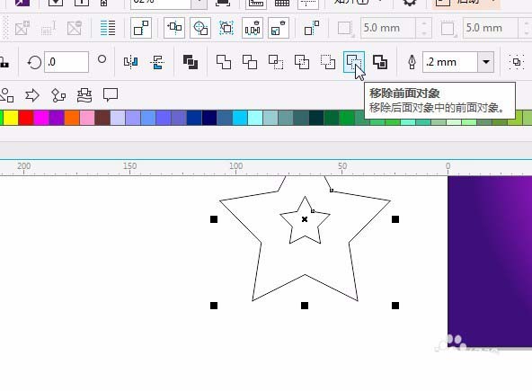 5、点击选择工具,将星星缩小一些,按住shift键,左键拉动右键点击复制一个。如图。选中这两个图形,在属性栏选择减去前面对象,复制三个,分别调整大小放置在不同的位置。如图。