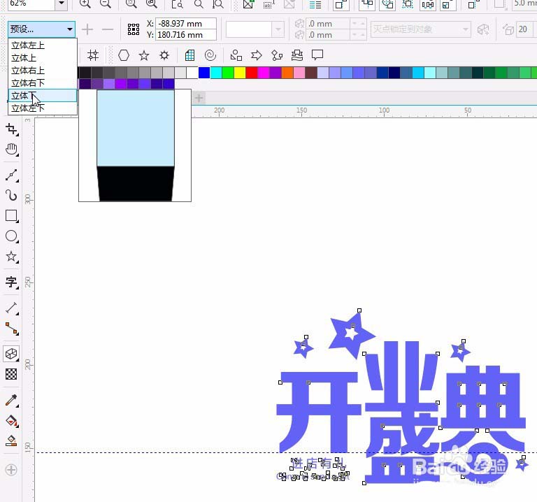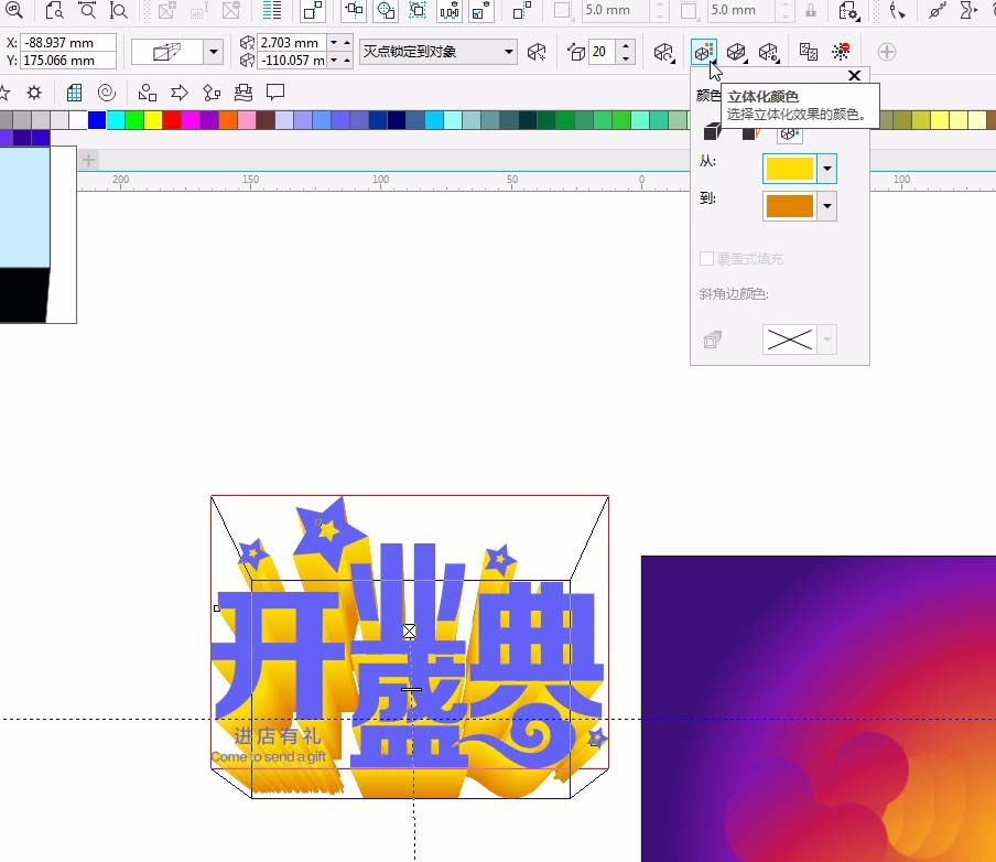 7、选择立体化工具在属性栏的预设里选择立体下,在属性栏中更改立体颜色从#FDDD03黄色到橘黄色#E18501;设置灭点坐标X:0MM,Y:-175.864MM;深度为5,