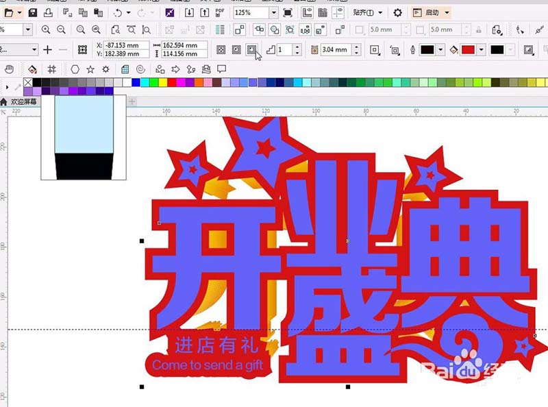 12、按ctrl+c,ctrl+v原地复制一个,选择轮廓图工具,选择内部轮廓,轮廓偏移1.5 MM,选择对象拆分轮廓图群组。然后给内部填充白色,效果如图。然后导入素材,气球和礼物,和星光。