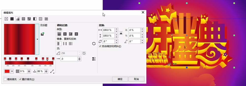 11、给底下的立体化文字拆分立体化群组,按F11添加渐变色,①#6E0309②#870E12③#DA1721④⑤#A9120F⑥#620817⑦#BE0915⑧#CC1626⑨#E7160F⑩#9C0E08;按G调整颜色如图。位置。