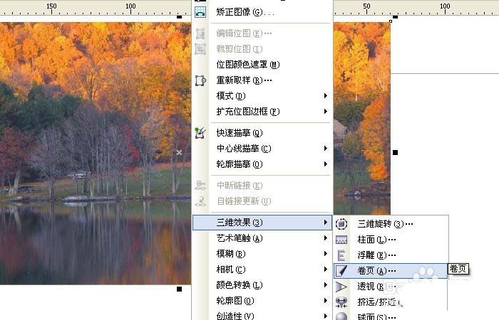 1、打开CorelDRAW软件,新建一个空白的文件,鼠标左键单击菜单【文件】>>【导入】找一张风景图片作为素材。接着,鼠标左键单击菜单【位图】>>【三维效果】>>【卷页】,如下图所示。给素材图片添加一个卷页效果。