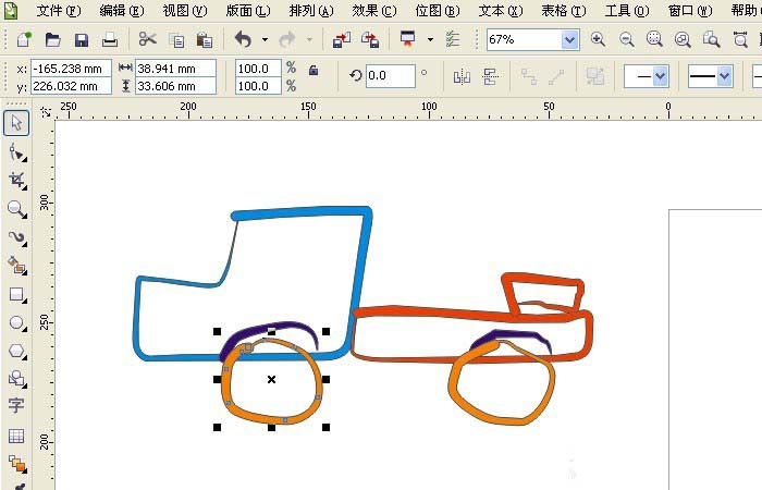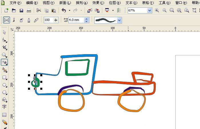 3、然后,用艺术笔工具绘制出洒水车的车尾的线条,并填充为红色,如下图所示。