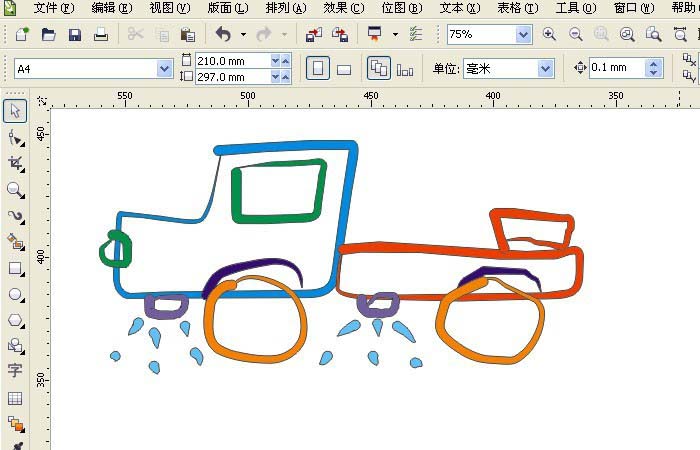 4、接着,用艺术笔工具绘制出洒水车车体车轮的线条部分,并填充为棕色,这样,洒水车就看起来好看了,如下图所示。