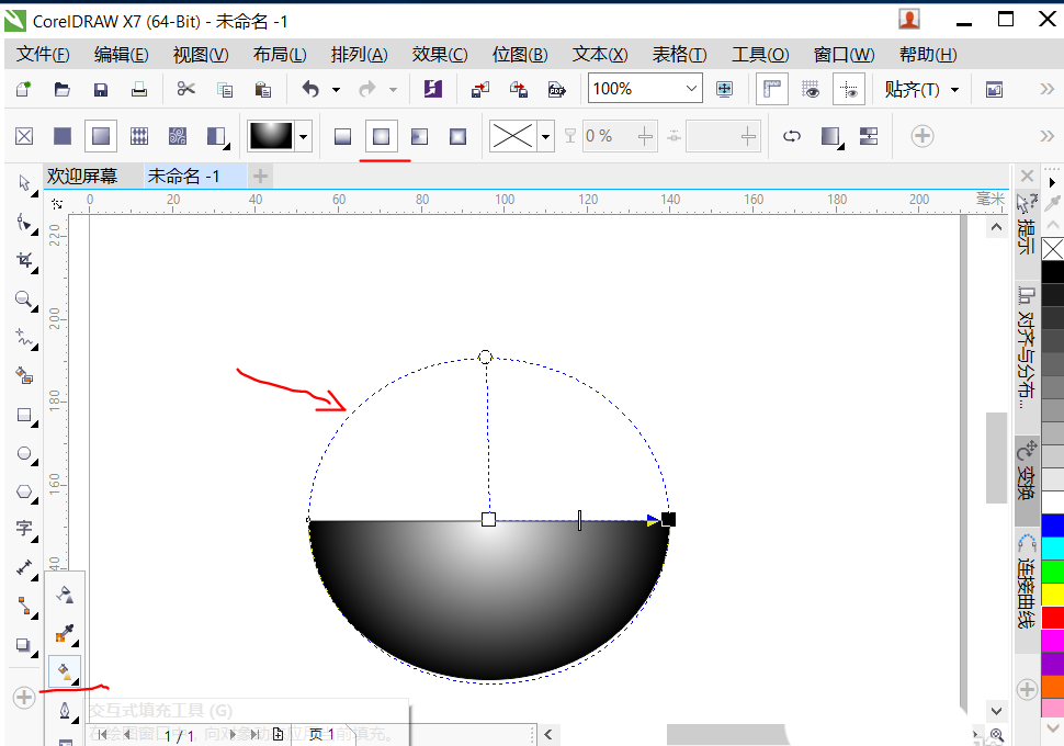 3、选择交互式填充工具,选择椭圆渐变填充,调整椭圆填充虚线框适合第一个椭圆边