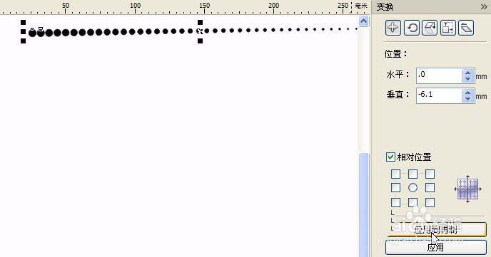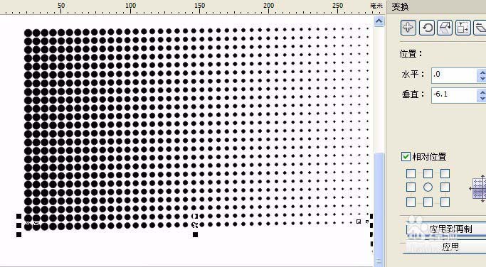 5、最后取选择工具框选全部,打开【窗口-泊坞窗-变换】,在垂直一栏中填入你要移动的数值,点击【应用与再制】就可以得到一个菲林网点了。