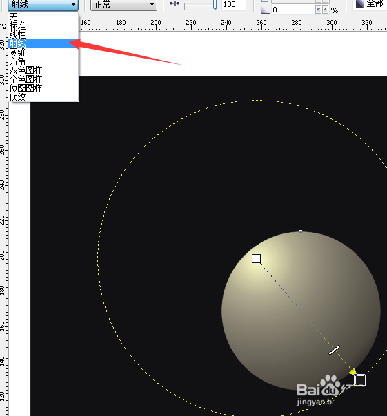 6、然后我们选择透明工具中的射线,如图所示,内圈调到白色,外圈调到黑色。