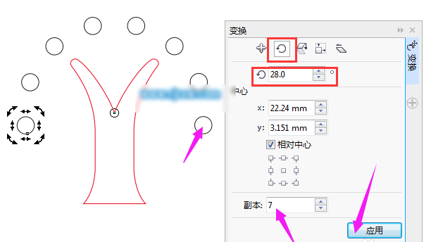 9、点击排列菜单,设置旋转,设置28的角度, 副本为7,点击应用