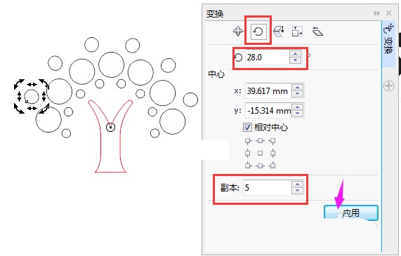 12、还是一样点击排列菜单,设置旋转,设置28的角度, 副本为5,点击应用