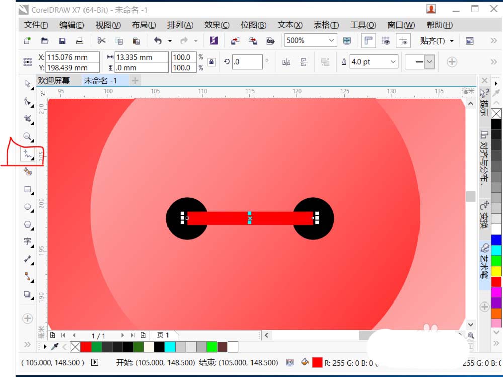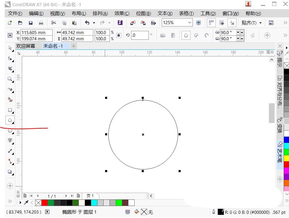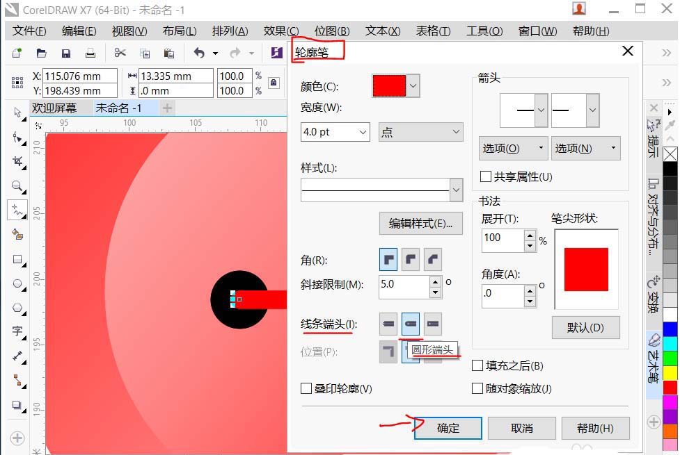 5、选中直线,选择轮廓笔工具中线条端头为圆形端头