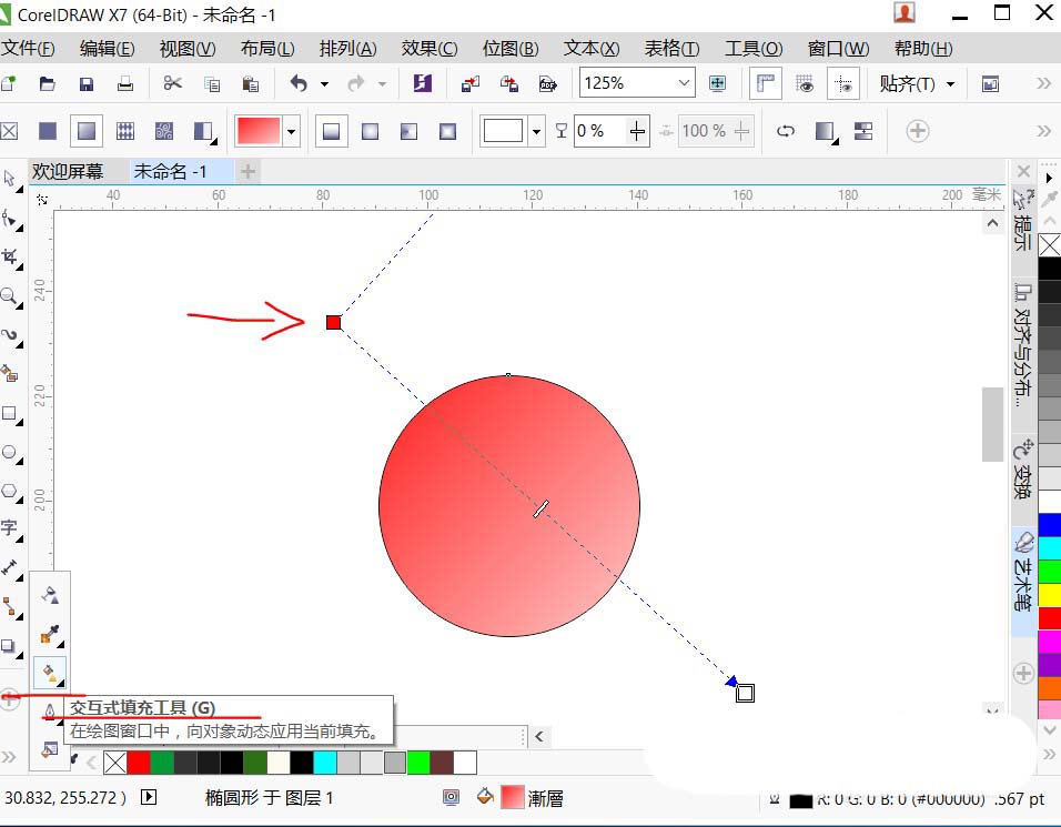 2、选择交互式填充工具,主色红色进行填充,改变填充点位置