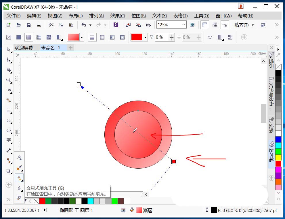 3、去掉边框色,原地复制一个正圆,缩小为合适大小,选择交互式填充,与上个圆填充方向相反,实现立体感觉