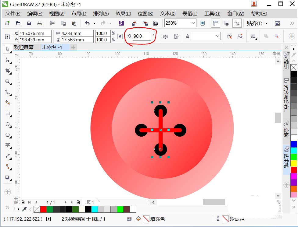 6、Ctrl+G 组合两小圆和直线,按小键盘“+”原地复制一份,旋转90度,一起组合所有对象