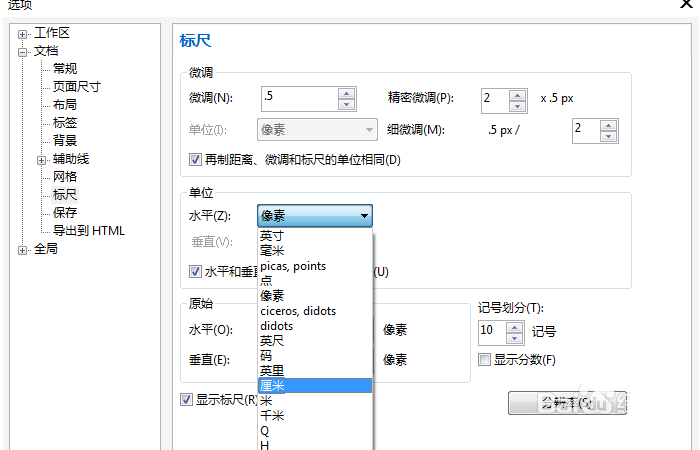 3、这里我们可以修改标尺的单位,比如我们修改成"厘米",如图所示;