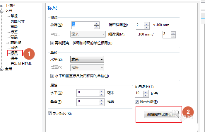 6、我们可以在"选项"窗口里找到"标尺",点击"编辑缩放比例",如图所示;