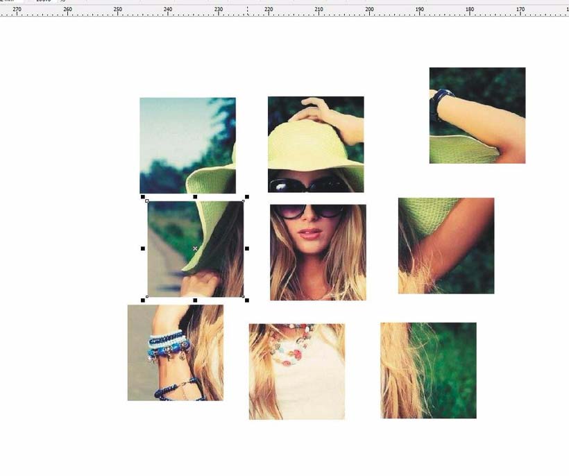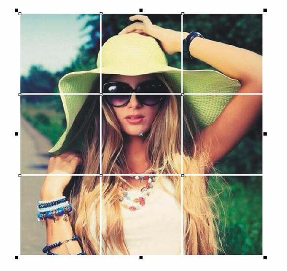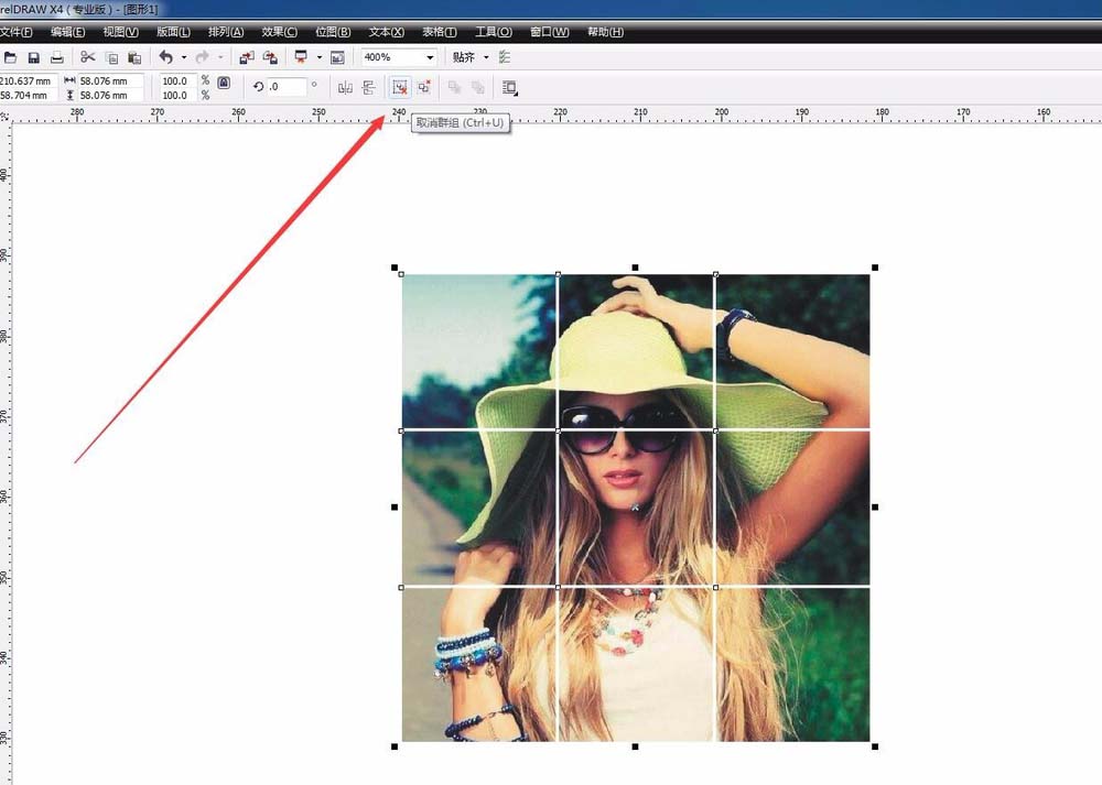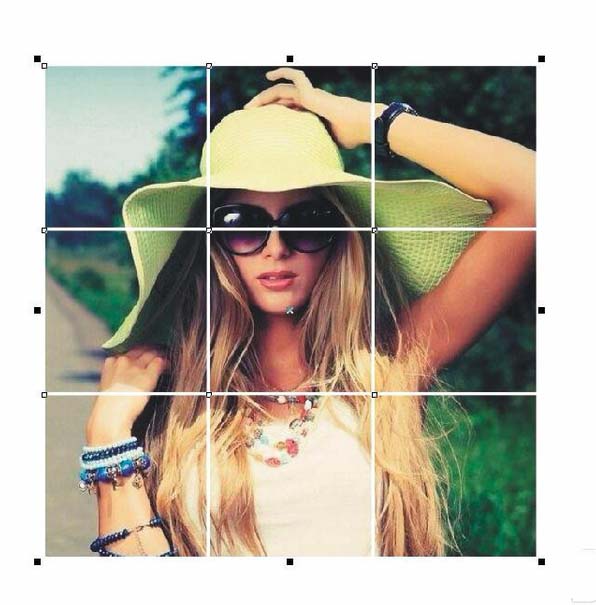 7、然后取消群组,这个时候当我们移动小方格的时候,可以看到照片真的被我们裁剪成了九个部分,而且是完全等大的。边距也是完全相等的