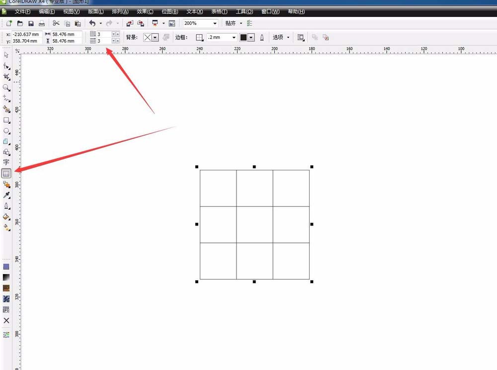 1、首先打开CDR软件,新建一个页面尺寸,我们设置为A4然后在工具箱中选择表格工具,拖动绘制表格,按住CTRL键,绘制正方形表格使长宽相等,表格位横向3 竖向3,一共九个格