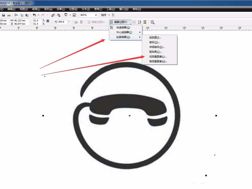 3、看上方我们会看到一个叫描摹位图的命令,我们选择轮廓描摹,然后选择低质量描摹就可以,高质量反而不好,会出现很多的锯齿,给我们后期调节带来很大的麻烦。然后单击确定