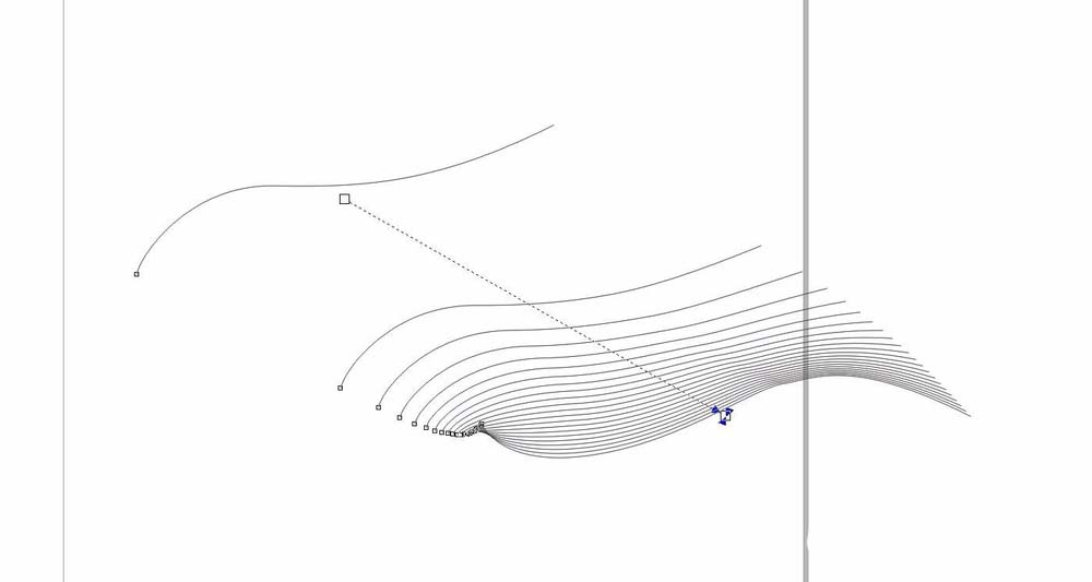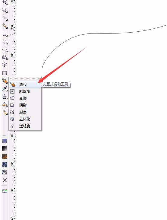 3、然后我们选择工具箱中的调和工具,对两条曲线进行调和处理。用鼠标拖动,从第一个曲线开始,拖动到第二条曲线,我们可以看到出现了很多的线条,这个时候就可以放开鼠标了。这样调和效果就做好了。