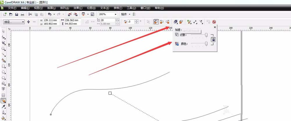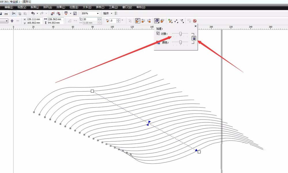 4、突然发现,我做的调和分布非常不均匀,这是怎么回事呢?在属性栏中,我们可以看到一个选项叫做对象和颜色加速。我们点击一下会发现,有两个滑块,一个控制对象,一个控制颜色,我们只需要将滑块拖到最中心的位置,这个时候对象就是等分排列的了。