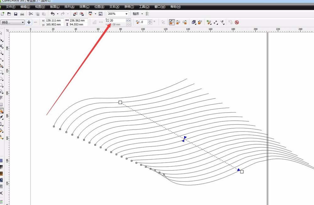 5、我们可以看到属性栏中有一个数量的选项,我们想要做出完美的效果,就需要改变他的数量,现在默认的是20,我们可以将数量改变成200,这样就可以看到不一样的效果了。不再是简单的几个线条了。