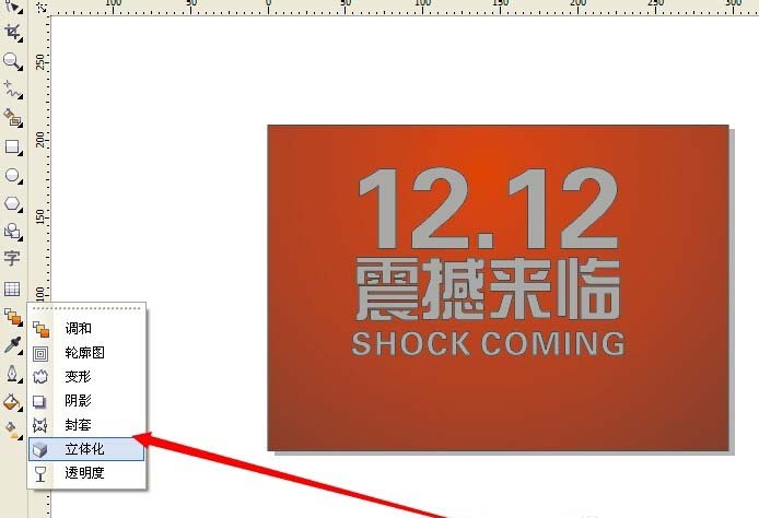 4、排好后,我们选择立体化工具,给文字做出立体化效果。工具箱中选择我们的立体化工具,然后选中文字,直接进行拖拉,就得到了一个立体字的效果,立体化的颜色,深度,方向都是可以手动调节的。