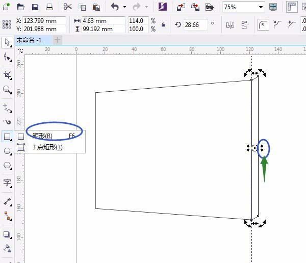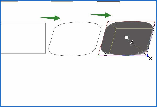2、用“矩形工具”在右边画出小矩形,按空格键后单击小矩形,对准中间的双箭头往上移动,成倾斜状。如图所示: