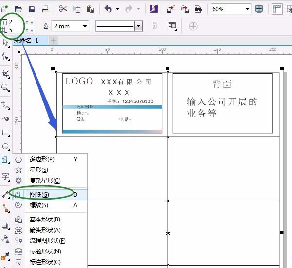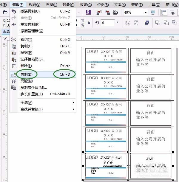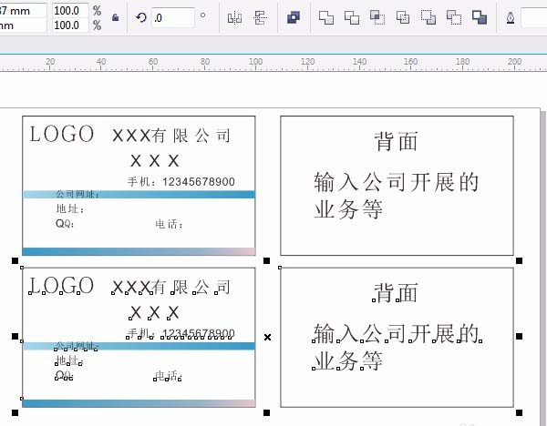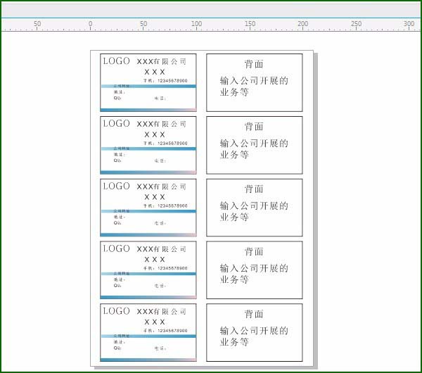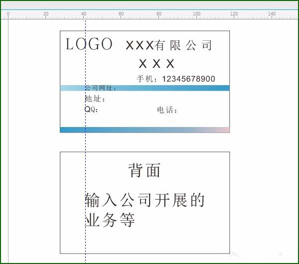 3、在矩形内正反面输入文字,不能太靠边,包括:公司名称、名字、联系手机或电话、公司地址、公司业务等。