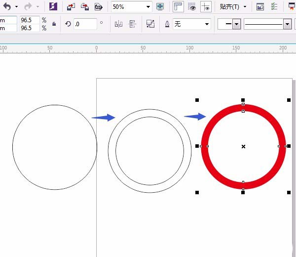 4、按空格键切换用“选择工具”,在属性栏中改“轮廓宽度”为6左右,宽度和同心圆大小差不多,右击调色板为红色。如图所示: