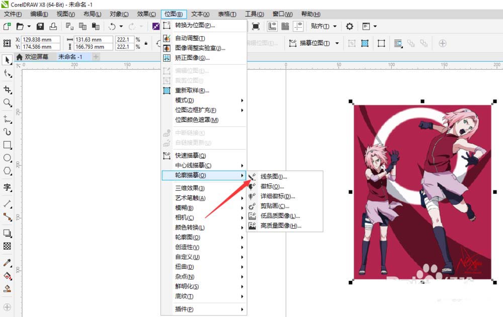1、导入图片,点击菜单栏“位图”—“轮廓描摹”—“线条图”,打开设置面板。