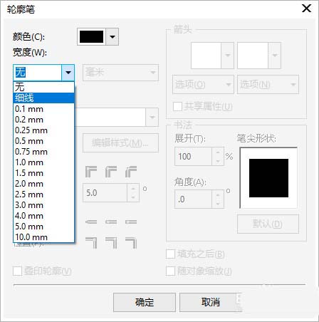 4、双击右下角的“轮廓笔”,设置轮廓线的宽度为“细线”。