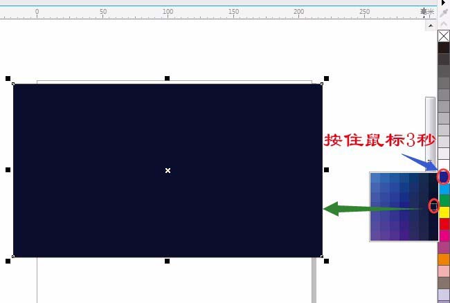 1、单击用“矩形工具”在页面中画矩形并填充深蓝色,再用“椭圆形工具”画一个小圆并用“交互式填充工具”,属性栏中选“椭圆渐变填充”拉大渐变范围,如图: