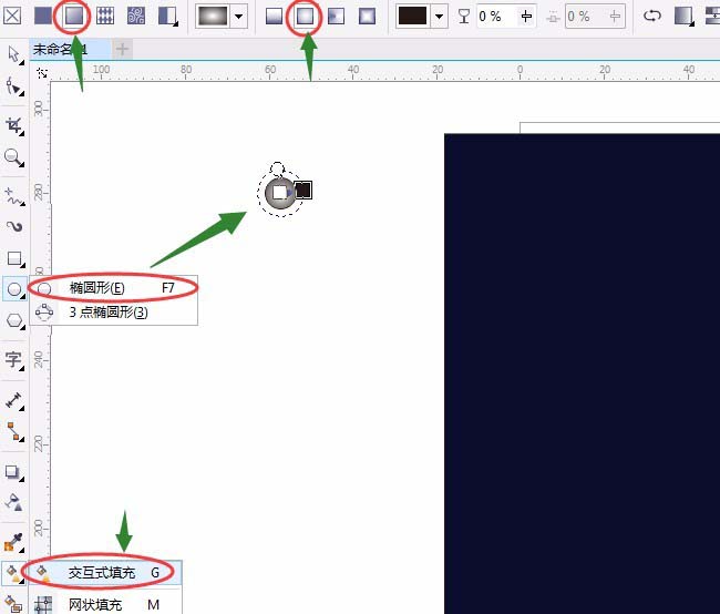 7、按“空格键”切换为“选择”工具,选定大圆移动右击复制一个,并适当变小,单击调色板最上方的×取消边线,再单击或按空格键用“交互式填充工具”属性栏中如图设置: