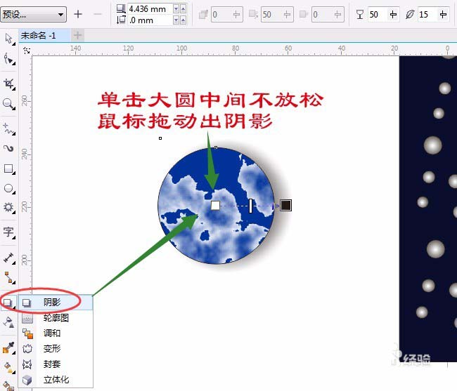 8、用“阴影工具”,单击小一点圆中间不放松鼠标拖动出阴影,属性栏中选“向外”,颜色选“白色”如图设置: