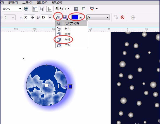 5、用“阴影工具”,单击大圆中间不放松鼠标拖动出阴影,属性栏中选“向外”,颜色选“蓝色”如图设置: