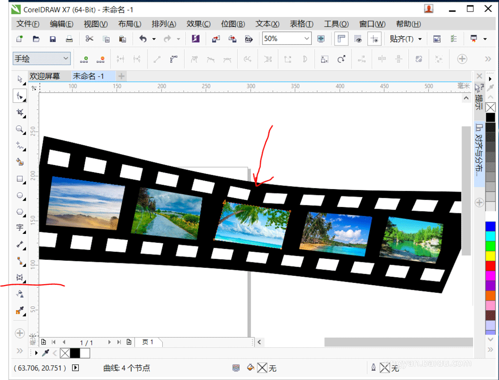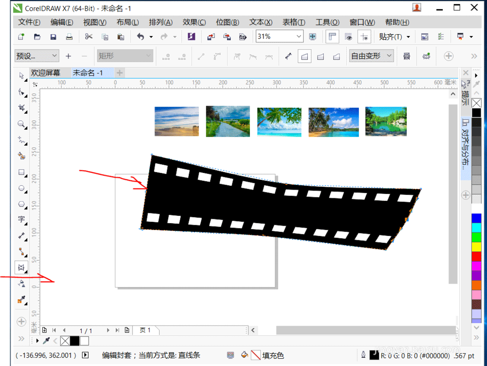6、将图片移入胶卷图形内,在选择工具下旋转调整角度