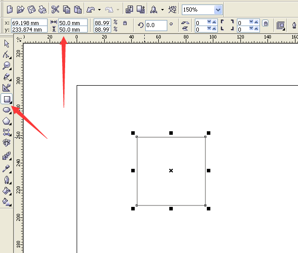 1、在电脑上打开CorelDRAW软件,选择”矩形工具“,按着Ctrl键画一个正方形,并且设置正方形的边长为50mm。