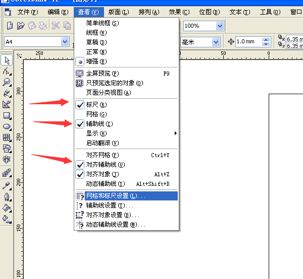 3、选择菜单栏上的“查看”,将“标尺”,“辅助线”和“对齐辅助线”都勾选上。