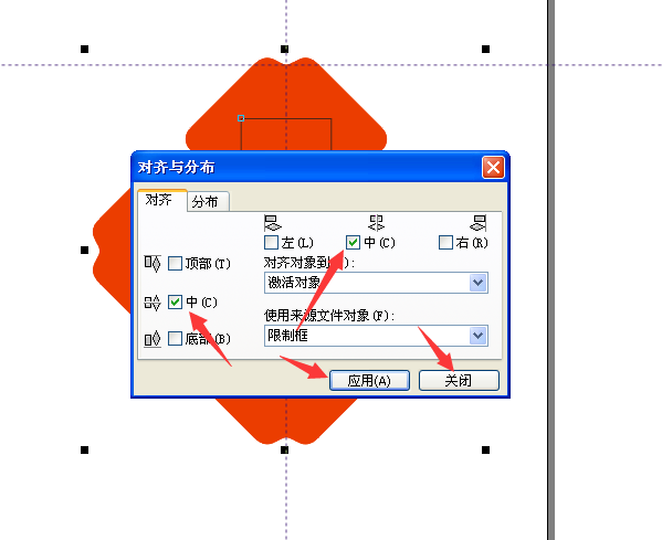 22、将左右居中和上下居中都勾选上,再点击应用,最后点击关闭。