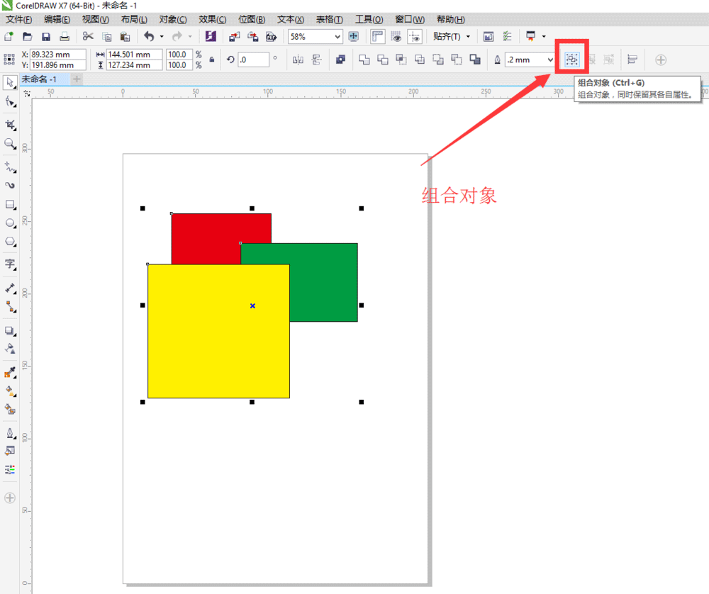 5、我们在选择工具的属性栏中可以看到组合对象。在cdr中群组命令被叫做组合对象,它的快捷键是Ctrl+G,如下图所示。