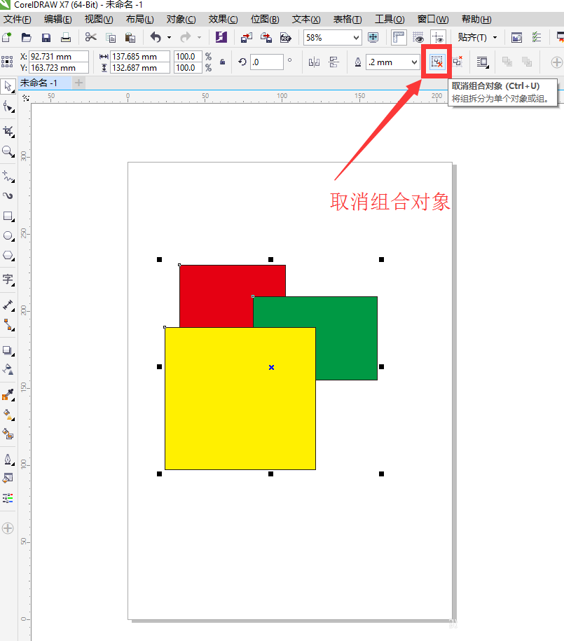 2、取消编组也是在选择工具属性栏中的取消组合对象,快捷键是Ctrl+U,如下图所示。
