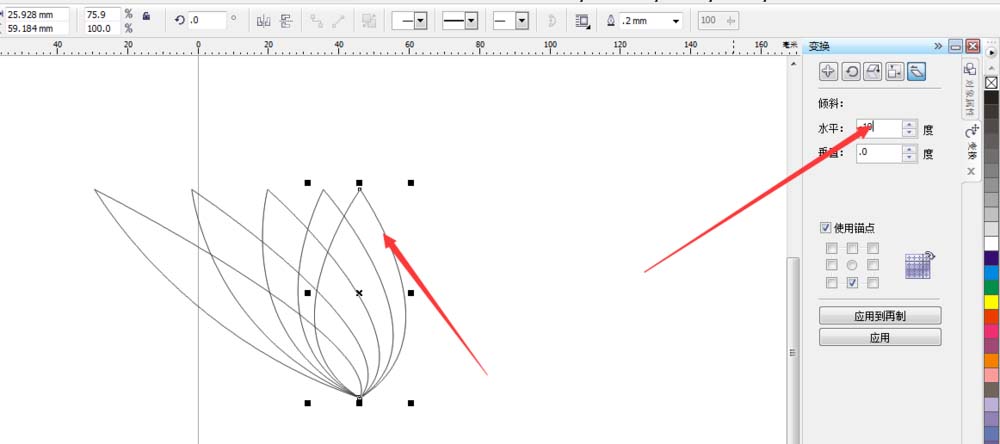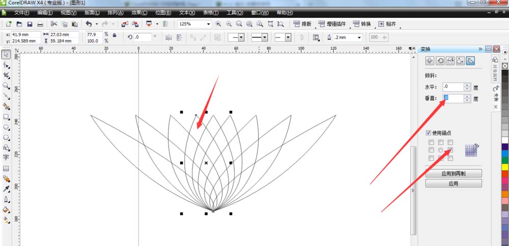 4、连接完成,全部选择并设置角度单击再制(角度自设,花瓣数量自设),同样的方法把另一边业做出来。