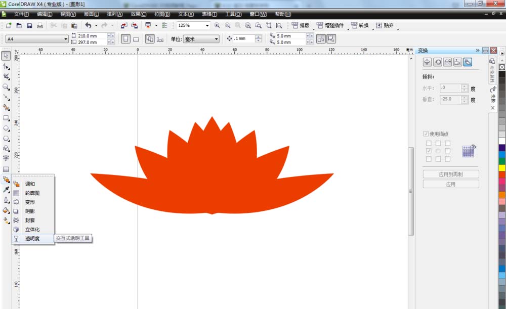 6、接下来单击调和工具,选择透明度(在菜单栏选择标准,调整透明度)