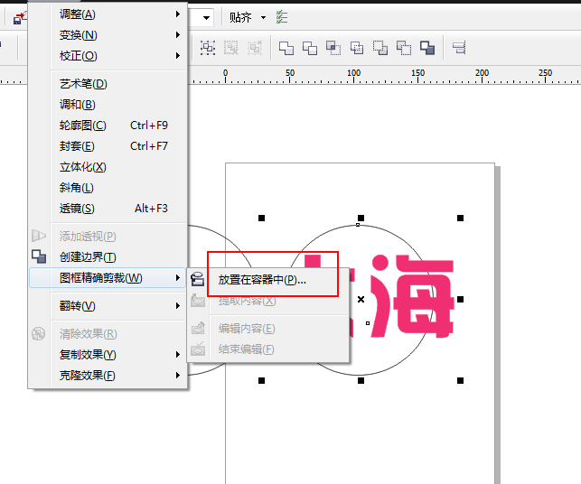2、先选中文字,点击“效果”-“图框精确剪裁”-“放置在容器中”,点击一下圆形框。