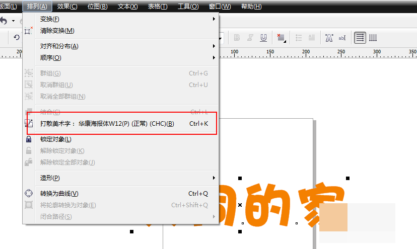 1、打开CorelDRAW,输入文字。按住快捷键ctrl+k打散文字,文字大小调整。