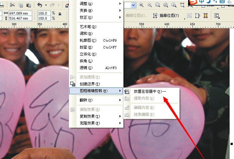 7、将锁定的对象解除锁定,然后选择图片,右键拖动至形状内,松开鼠标,图框精确剪裁,放置容器中。可以利用形状工具裁剪掉多余的,减小空间。完成。如果位置不准确,可以进入图框编辑内容,调整到适合的位置,结束编辑。完成。