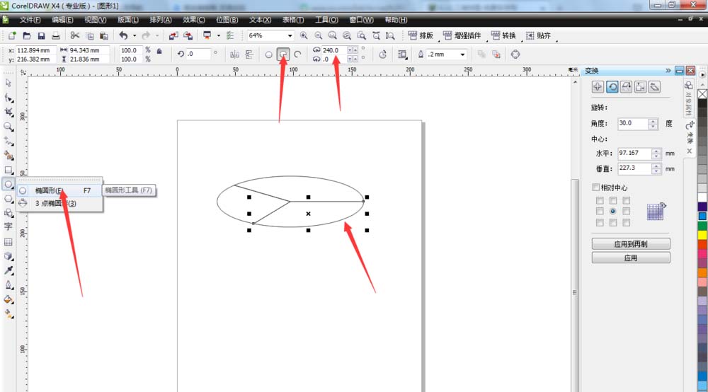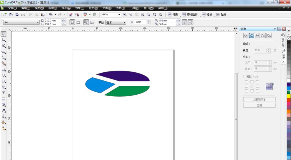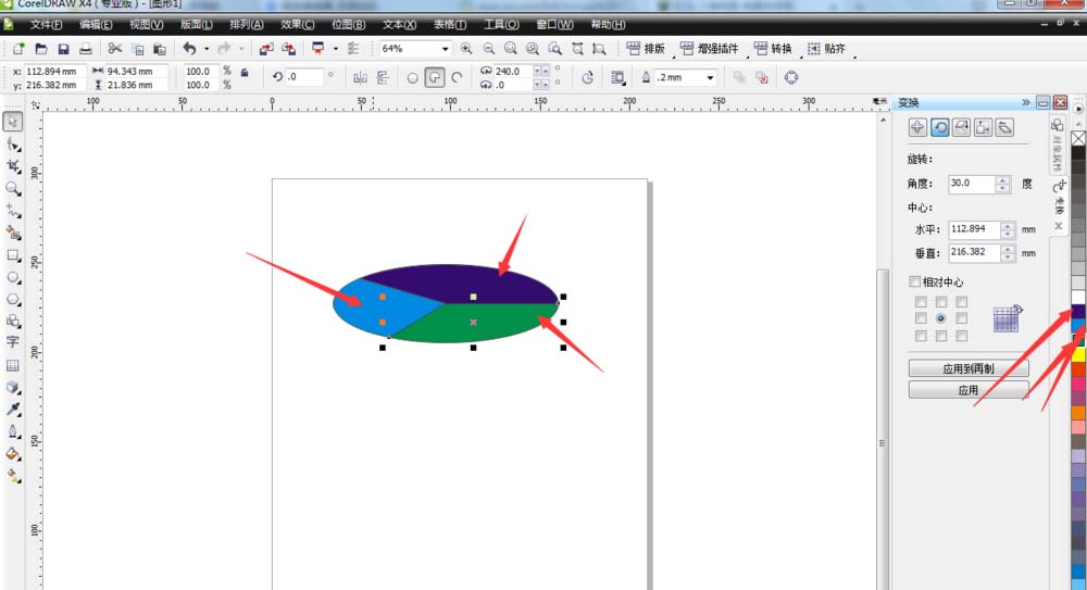 2、单击椭圆工具,画一个椭圆,单击菜单栏饼型,并设置角度,然后按住键盘+号键复制一个,并调整角度,再复制一个调整角度。角度调整好,分别填充颜色。
