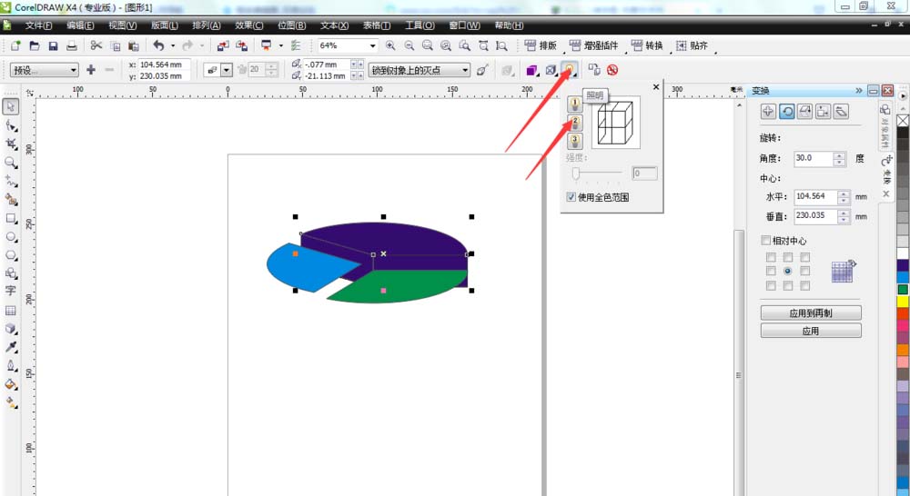 5、调整好立体大小,单击照明工具选择照明2,调整好光线照明。