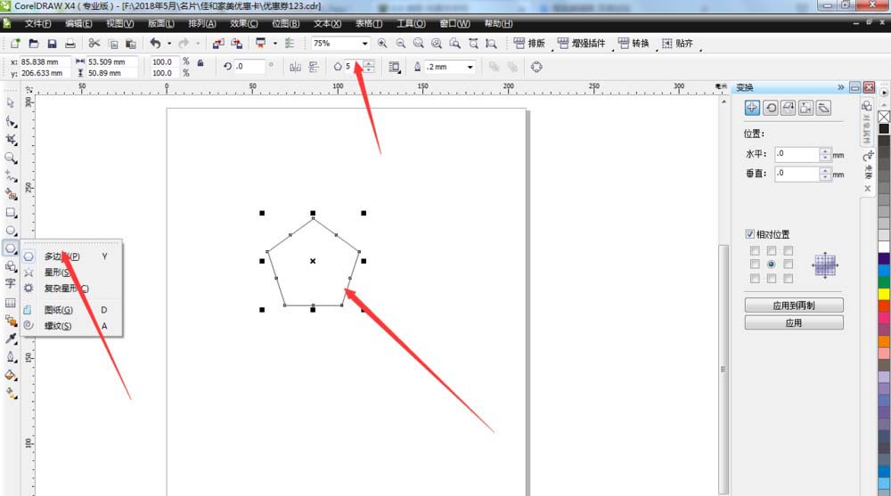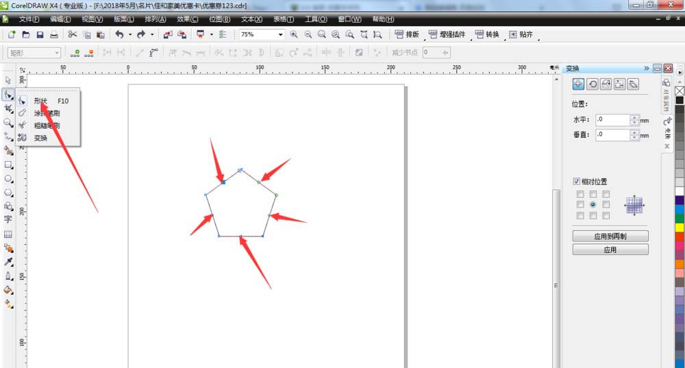 2、单击多边形工具,按住Ctrl键画一个五边形,再单击形状工具,把多边形边上的节点全部去掉。
