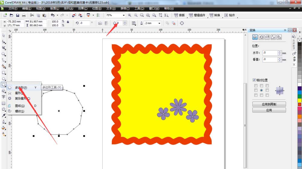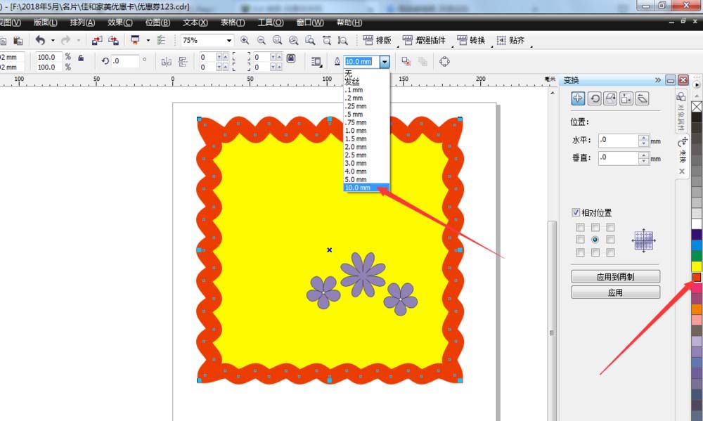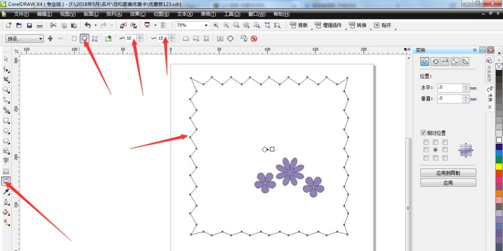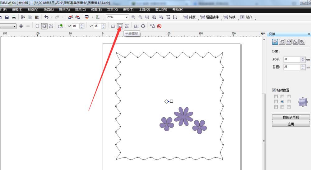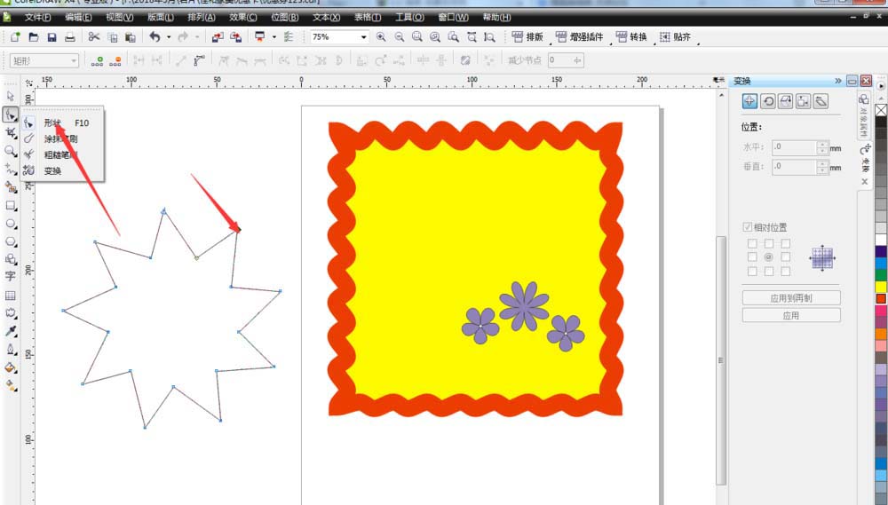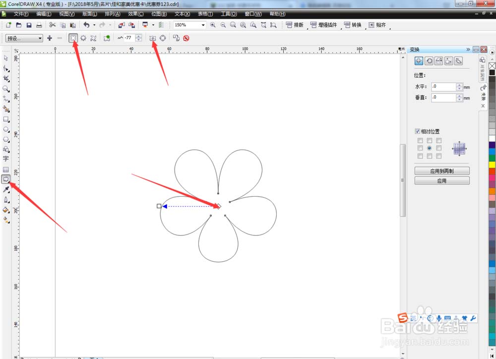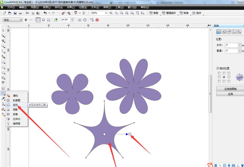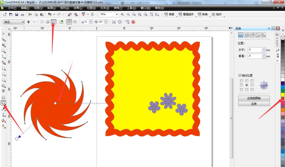 9、选择交互式变形工具,单击扭曲变形沿着中心点旋转,并填充为红色,调整好大小放在做好的图内。