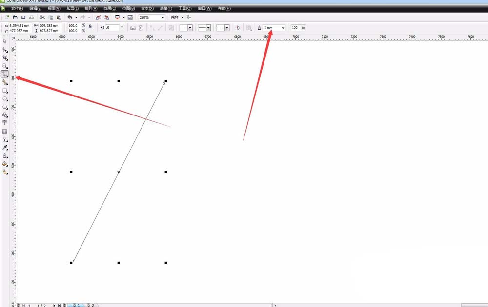 1、首先打开CDR软件。新建一个文件,尺寸任意设定。然后选择工具栏中的直线工具,绘制一条斜线。如下图所示。可以在属性栏中设置线的粗细,比如我设置为0.3。这个要根据文件的大小而定,尺寸小的线就细一点。尺寸大的就设置的大一点。